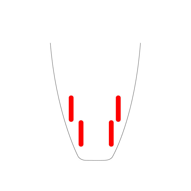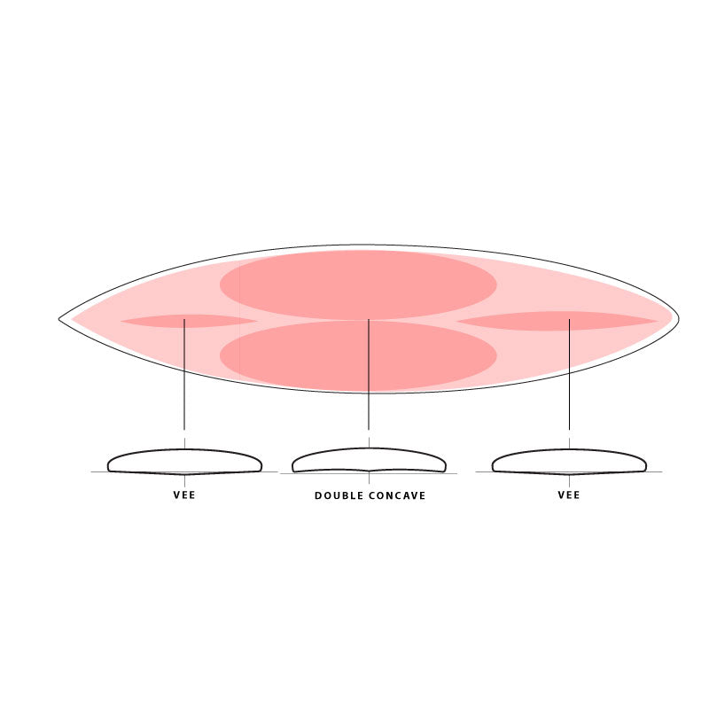 The Mammoth features very slight vee in the entry, which flows into a subtle double concave under the chest, to a deep double through to behind the front side fins. From behind the front side fins to the tail exit, a prominent vee bottom is placed to balance the bottom for hold in waves of consequence.