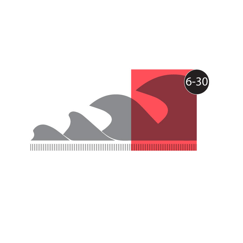 This combination allows for maximum control at high speed in critical/ large waves, with the ability to turn quickly, adjust and knife steep take offs.